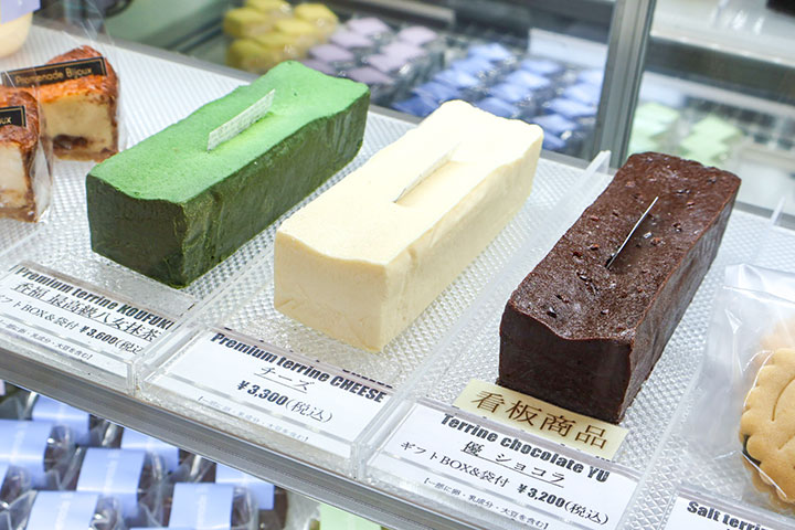 店内のショーケースには、濃厚なカカオを使った「テリーヌショコラ 優」をはじめ、八女抹茶やチーズテリーヌ、ピスタチオなど、個性豊かなテリーヌが並びます。