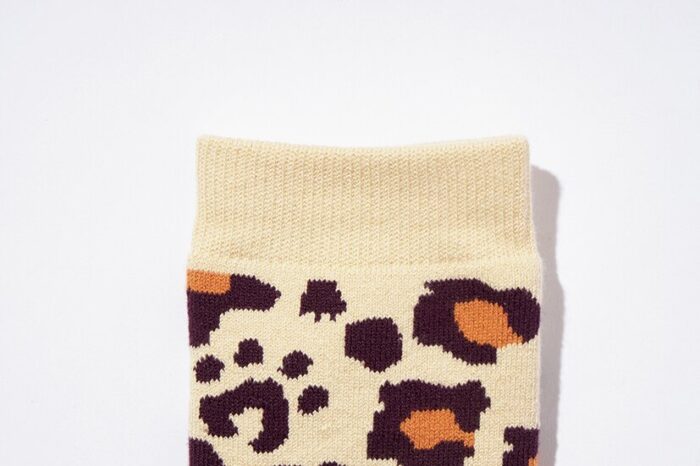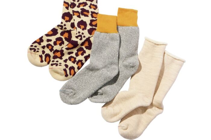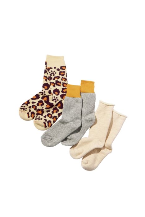 奈良県にある国内随一の靴下生産地で作られているROTOTO。その履き心地は折り紙付きだ。購入したのは定番のダブルフェイスクルーソックス(右)2750円、ダブルフェイスクルーソックス“シルク&コットン”(中)2310円、パイルレオパードクルーソックス(左)2530円。(ROTOTO)