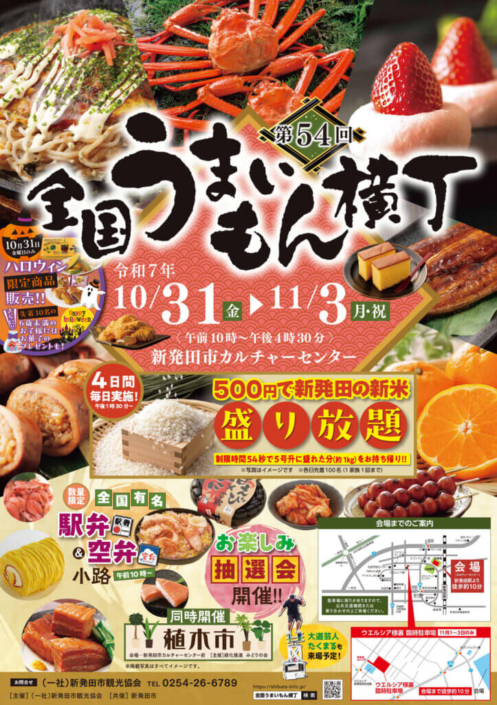日本全国の名産品「うまいもん」を販売する恒例イベント。食べておいしい「美味いもん」はもちろん、匠の技が光る「巧いもん」の販売も。新発田の新米盛り放題(5合升、500円)や植木市、ハロウィン限定商品の販売(10/31のみ)、駅弁&空弁の販売といった楽しい内容が盛りだくさんです。