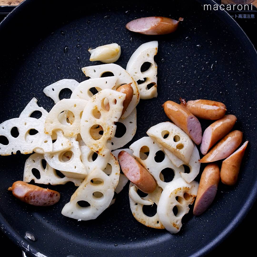 2: 両面焼き色がついたらウインナーを加えて焼き色がつくまで炒めます。