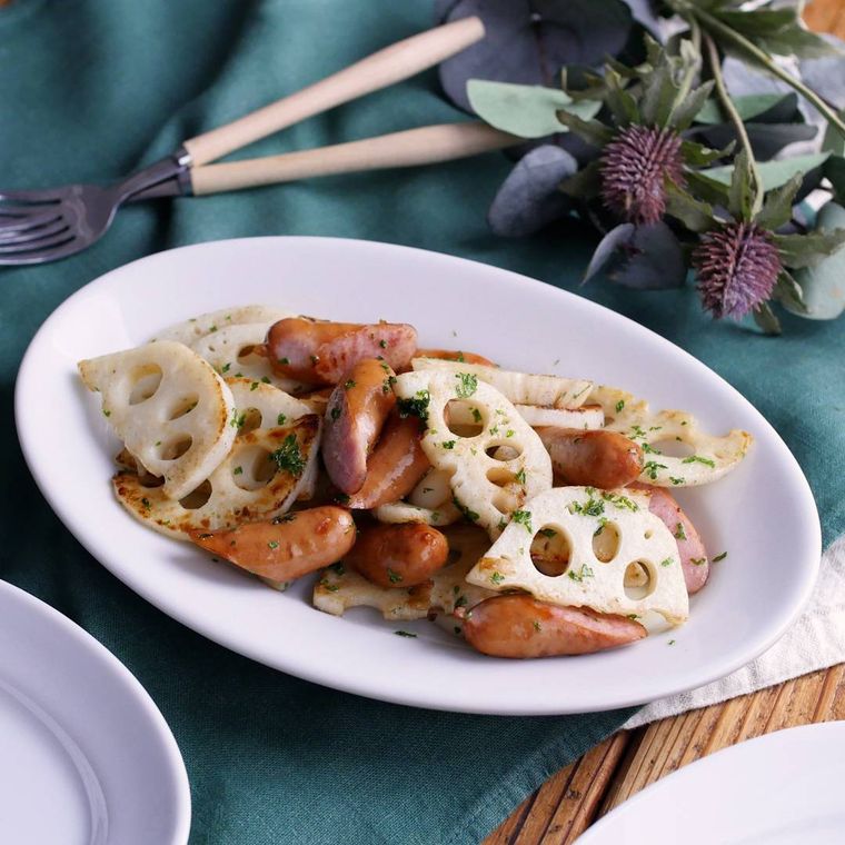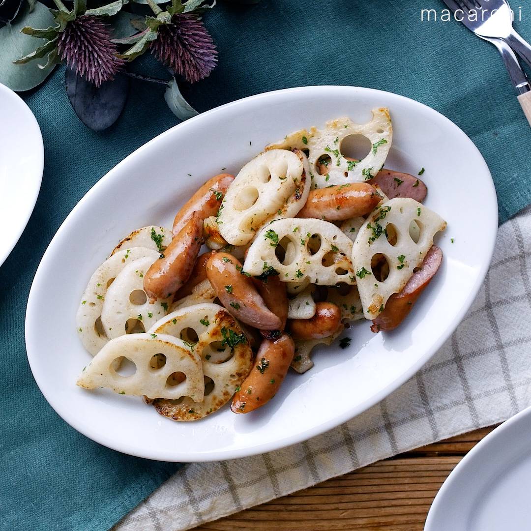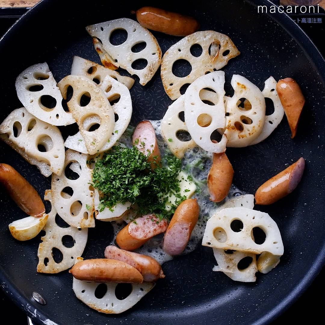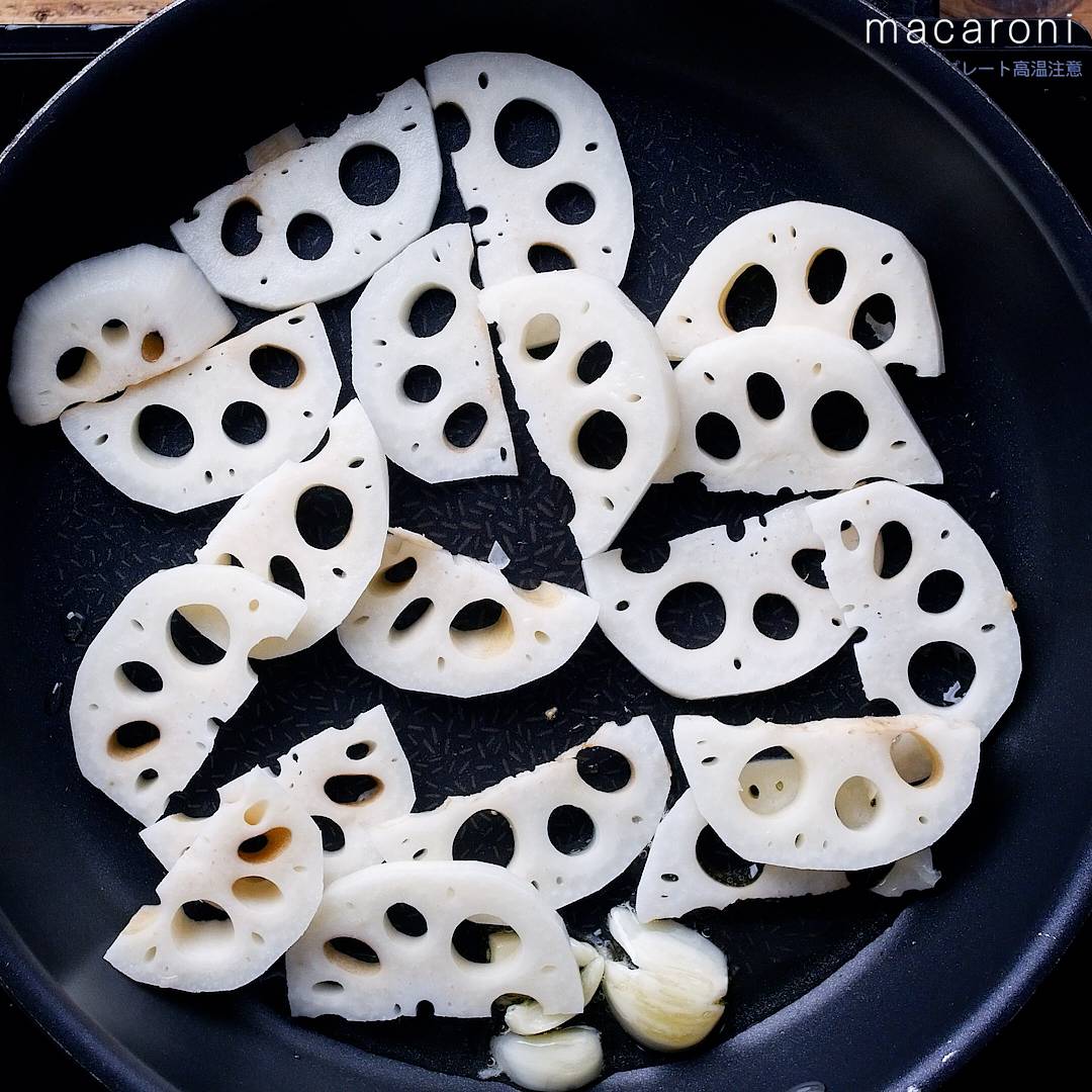 1: フライパンにオリーブオイル、にんにくを入れて熱し、香りが立ったられんこんを並べ入れます。