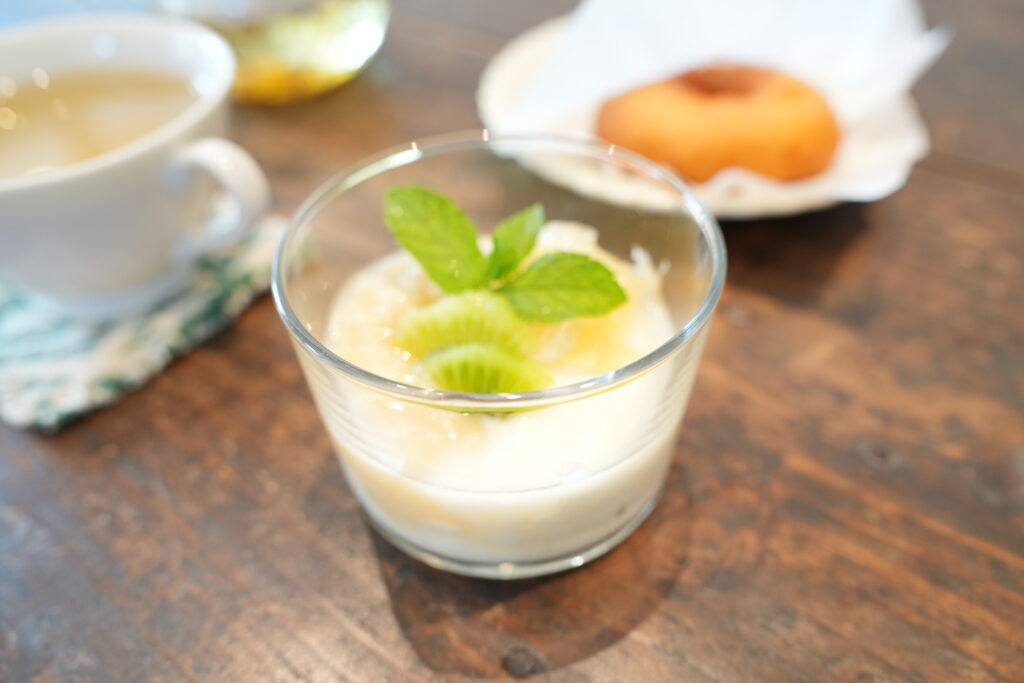 甘麹ヨーグルトは若桜町の「藤原みそこうじ店」さんの甘麹を使用。甘酒のようなまろやかな味わいで、朝の体にすっとなじむやさしい味でした。