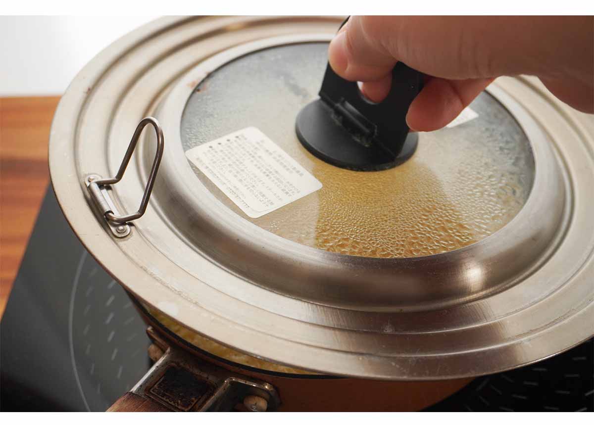 ⑤蓋を開け、ヘラなどでひっくり返します。弱火で5分ほど焼きます。