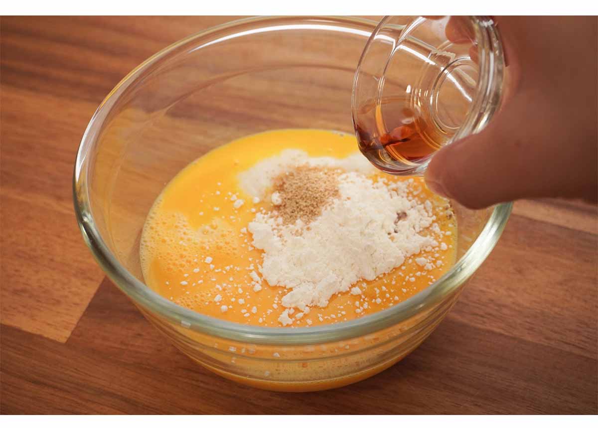 ③ボウルにすりおろした長芋、溶いた卵、薄力粉、めんつゆ、和風顆粒だしの素を入れ、よく混ぜ合わせます。