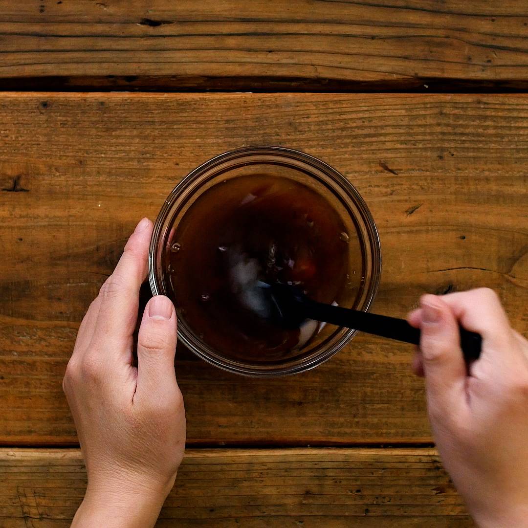 2: ボウルに黒酢あんの調味料を合わせます。