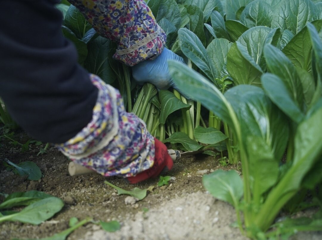 やさしい笑顔の今村さんは、南区の八剣山すぐ近くで小松菜を育てています。狭い間隔でお行儀よく並んだ小松菜の葉はとっても濃い緑色でした。ひとつひとつ丁寧に刈り取っているところも見せてもらったのですが、ケースに入れてもふかふかしていて、葉も茎も立派なのがよくわかりました。