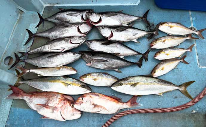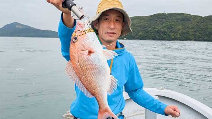 10月25日、佐賀県唐津市鎮西町串浦港の勇勝丸が壱岐周辺のタイ釣りに出船し、長岡さんがマダイを9尾と青物などをキャッチ。船長は「彼岸ダイサイズではありますが、1人7~9尾釣り上げていました」と話し、根魚交じりで土産を得ている。釣り大会を開催中。