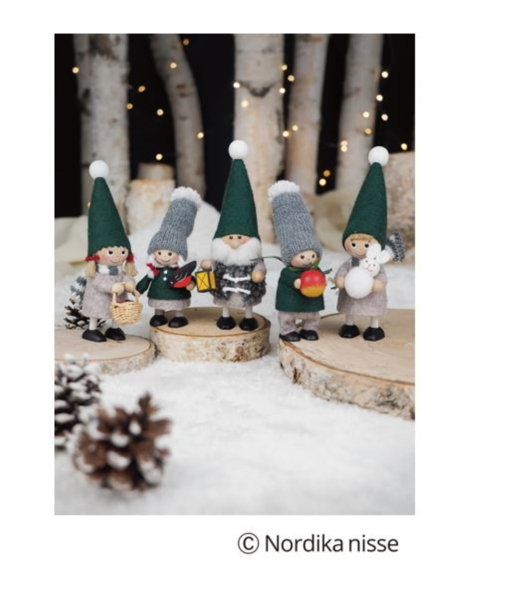 「ノルディカニッセ」の「ノルディックフォレストシリーズ」。「ベリー摘みの女の子」「ランタンを持ったサンタ」「ウサギを抱えた男の子」(各6,600円)、「小鳥と話す女の子」「リンゴを持った男の子」(各6,160円)