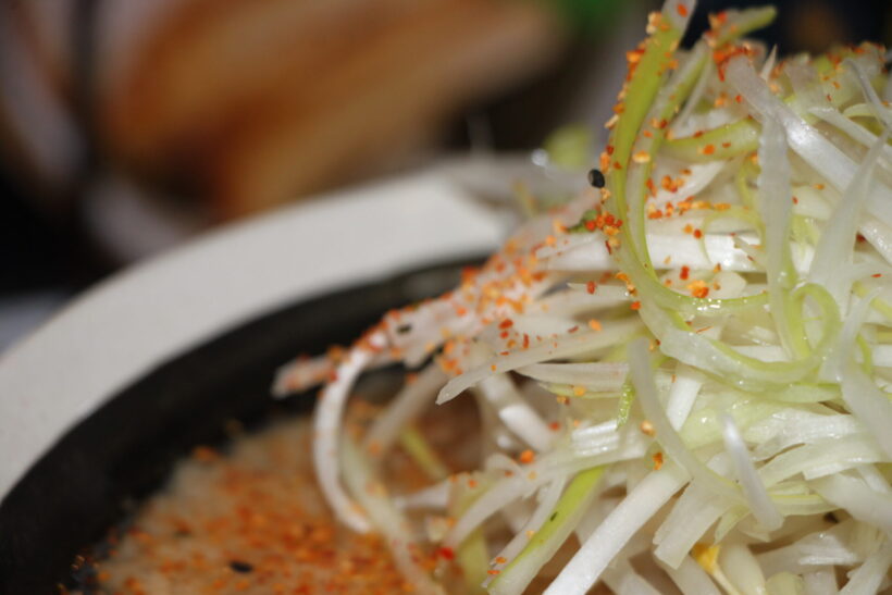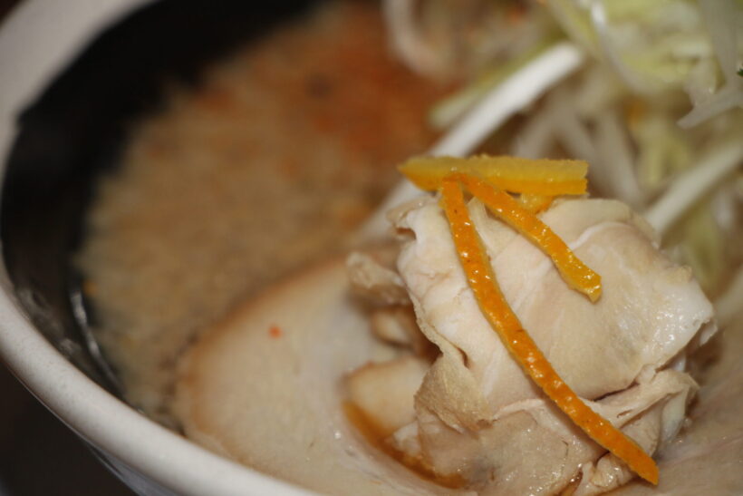 そんなことをつらつら想起しているうちに着丼。ほっほー、ビジュアルは秀逸だねい。吉相のこってりラーメンにこんもりとした白髪ねぎ+七味トッピング。チャーシューは定番のものと薄切りのふわふわチャーシュー。その上にゆずピール、分厚いメンマ。なんかストーリーあるね、この配置。