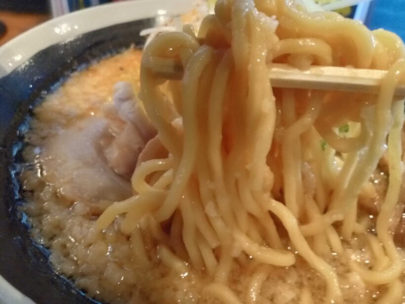 さて実食。おお、このパンチあるスープ。魚介が香ってこないのが逆に良い。外連味のないこってり、好きなんだよなぁ、これ。強めの動物系旨味を背脂で逆にまろやかにまとめている。相変わらずウマし。