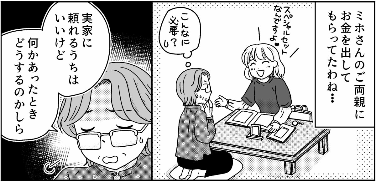 ミホさんにはマナー以外にも気になっていることがあります。そもそも身の丈に合っていない生活。あれじゃあ、息子が苦労するわ。 息子は昼間の仕事だけだと給料が少ないとミホさんに言われ、夜は週2~3日ほどアルバイトを入れるようにしたらしいのです。 ミホさんは専業主婦希望だそうで、ストレスになるから節約も考えていないのだとか。 いまは金銭的にも実家を頼れますが、ご両親がもっと高齢になったとき、自分たちが助けることは考えているのでしょうか? もしそうなったとき、ミホさんが働いていなければ金銭的な援助は息子がひとりで負担することになるでしょう。