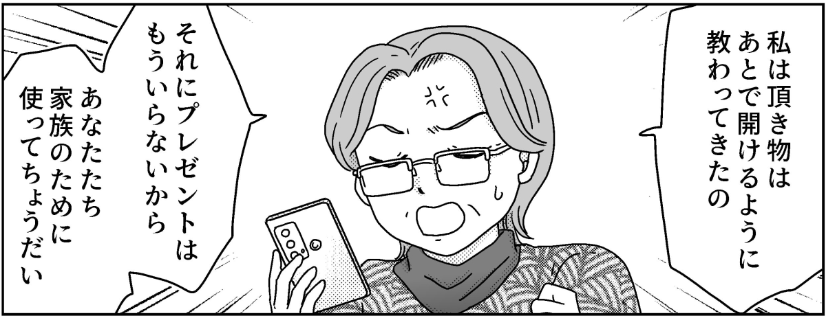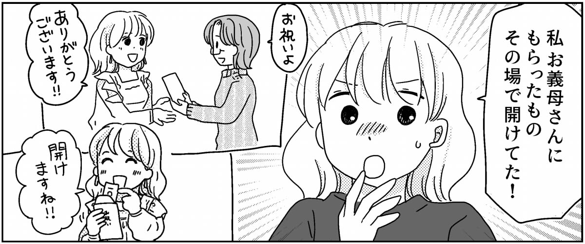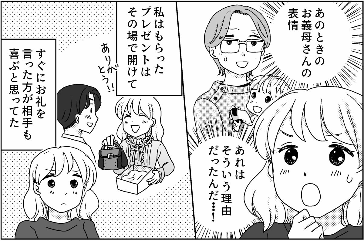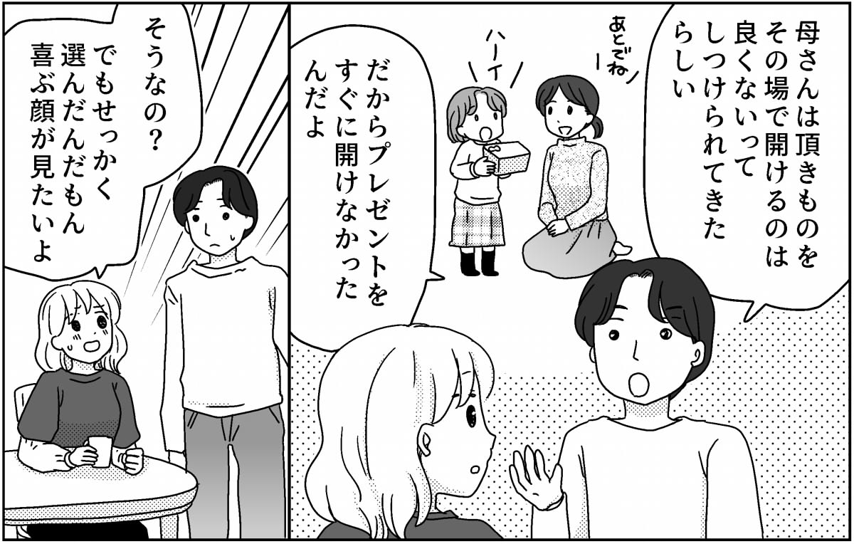 義母が私からのプレゼントを開けなかったのには理由がありました。頂きものは、すぐに中身を見ず、あとで中身を確認するもの。そう教わって育ったそうです。 いままで理由もわからず、義母の不機嫌な表情にモヤモヤしていました。 もしかしてその場で不満を言ったり叱ったりしないのは、義母なりの気遣いだったのかもしれません。 でも、ちゃんと言ってくれなければこちらは気付かないし、お互い良好な関係を築くのは難しいと思うのです。