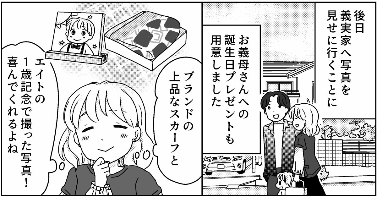 そして後日、誕生日のお祝いに義母へプレゼントを渡しに行きました。誕生日プレゼントとして、百貨店に入っている少し上品めなブランドのスカーフをプレゼントすることにしたのです。 旦那も「絶対に喜ぶと思う。ミホはセンスがいいな~」と喜んでくれました。それに、このあいだ息子の誕生日記念で写真館で撮った写真も持って行きました。しかし……。
