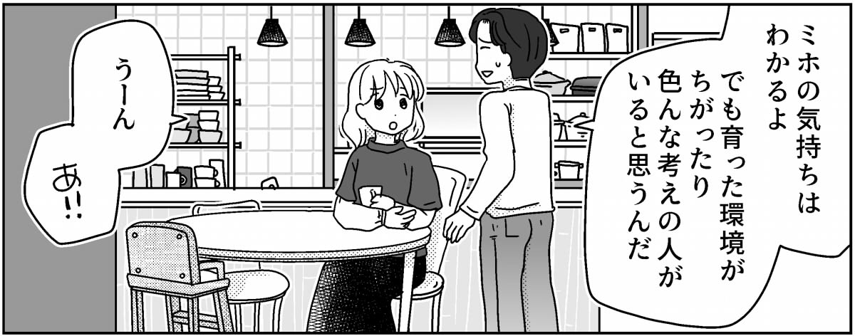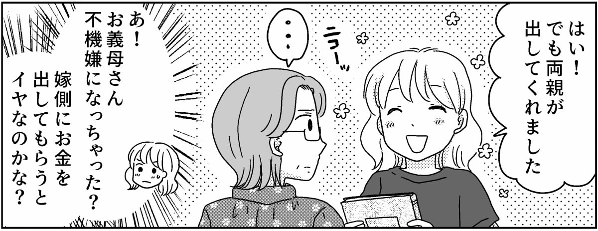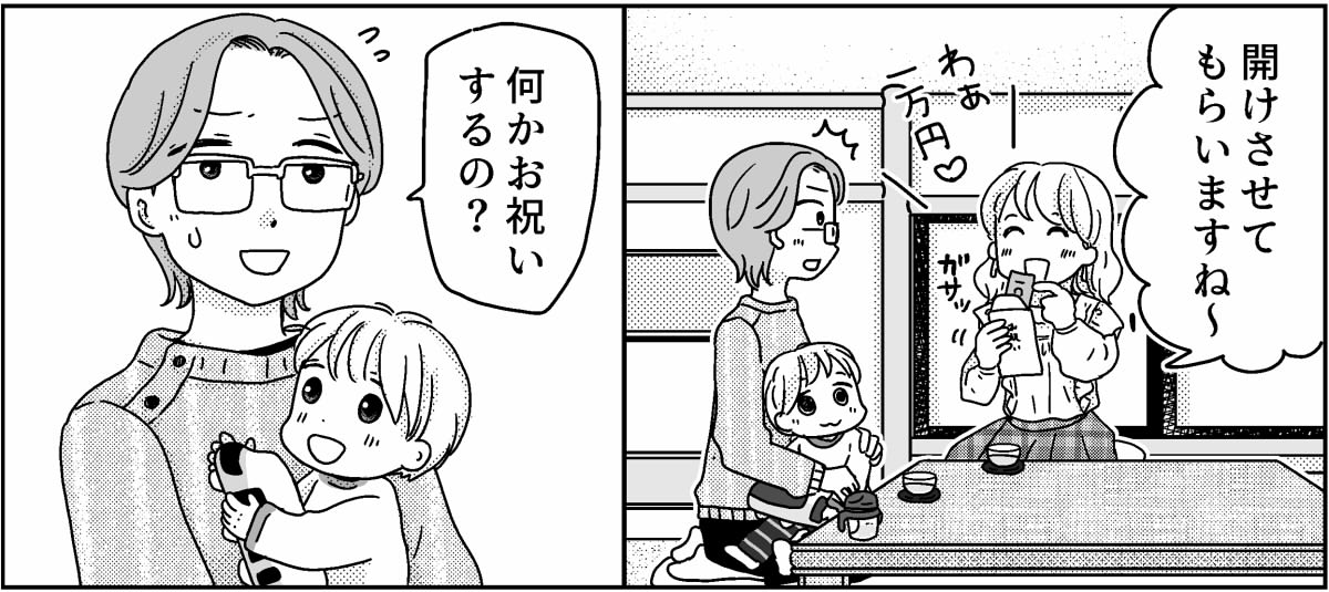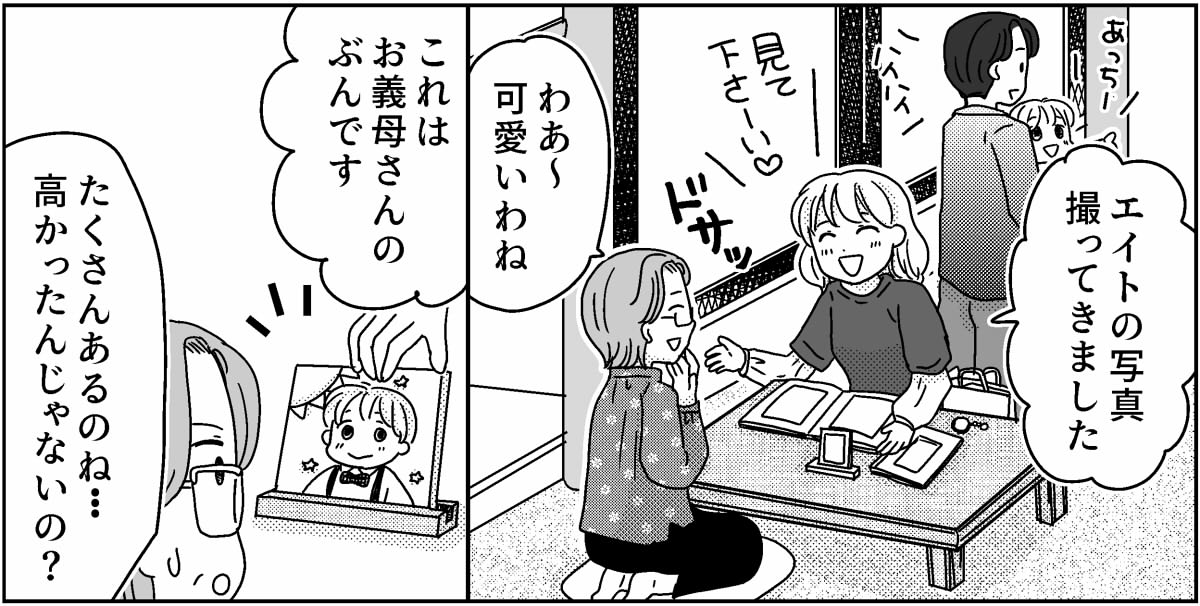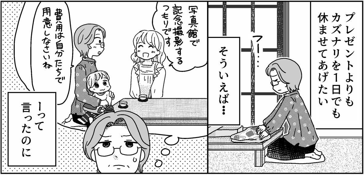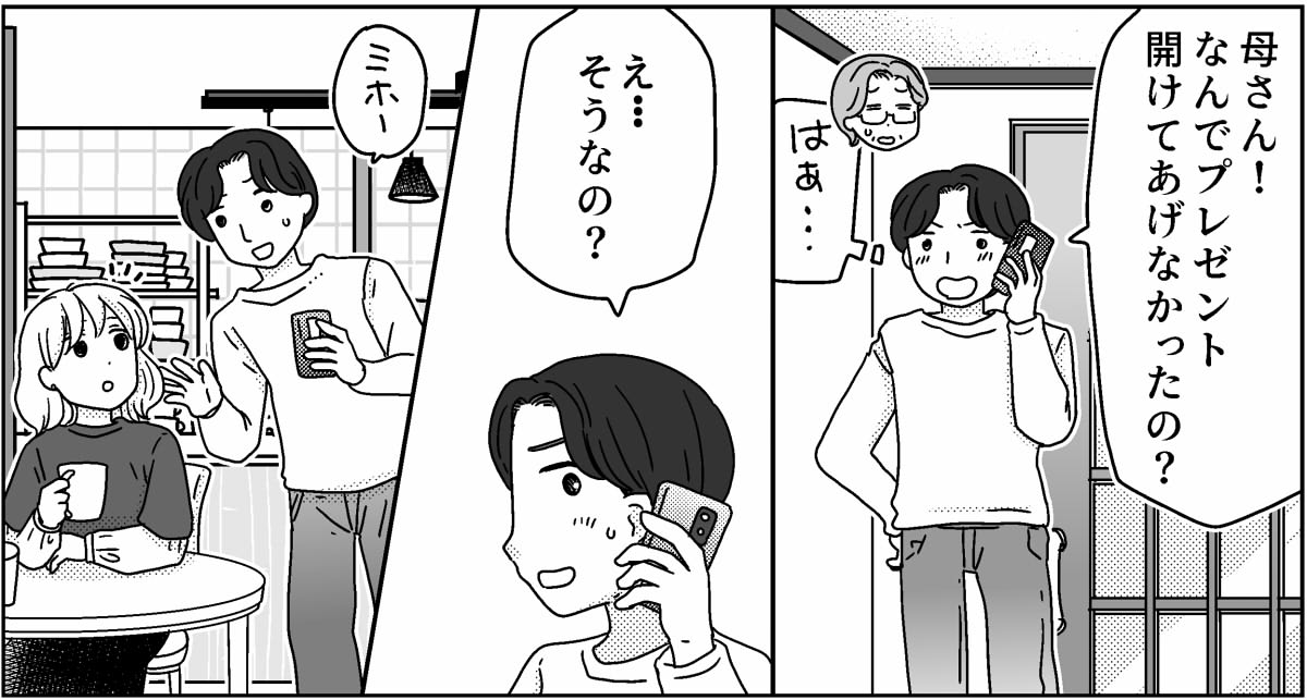 もしかして、うちの両親に写真館の費用を出してもらったのが悪かったのかもしれません。だって義母は「自分たちでやってね」と言っていたから。 「うちの母がごめん。俺がちゃんと言っておくから。でもミホが傷つくなら、うちの母にプレゼントを渡したり、会いに行ったりしなくてもいいんだよ」と、旦那は私をなぐさめてくれました。 しかしそのあと、気になった旦那は義母に電話をかけて事情を聞いてくれたようで……不機嫌になった理由を教えてくれました。義母は、頂きものをその場ですぐ開けるのはよくないという認識であったことがわかりました。