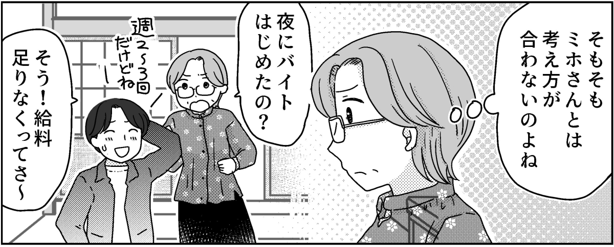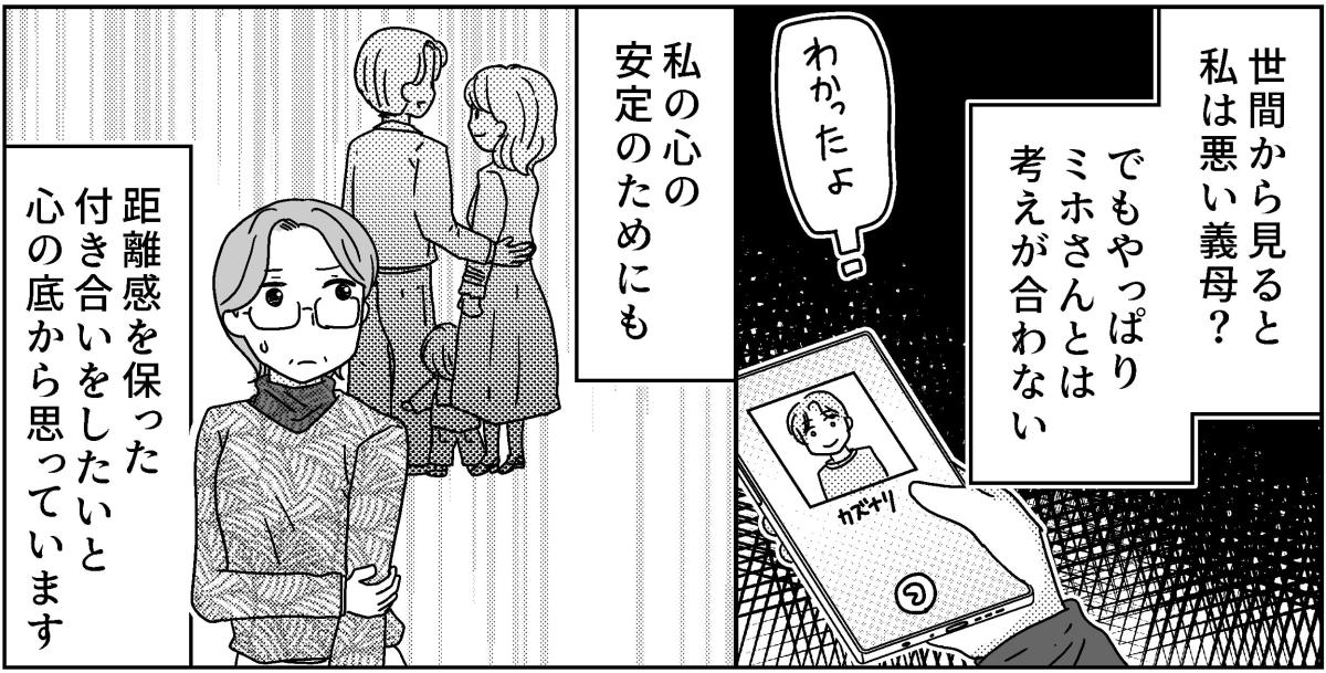 ミホさんのマイペースな生き方もいいと思います。でも息子の努力もあって、いまの生活があると気が付いてほしい。 いや、そもそも……もしかしたらミホさんは、息子だったら自分のために苦労してくれると思って結婚したのかもしれません。どちらにせよ、私の生き方とは合わない。 ミホさんも、自分は被害者だと思い込む前に、それぞれの価値観があると理解してもらいたいです。そうでないと、表面上の付き合いだって難しくなってしまいます。 世間的にも余計な口出しをする義母は叩かれますよね。だから黙って距離を取るようにするしか、私には思いつきません。