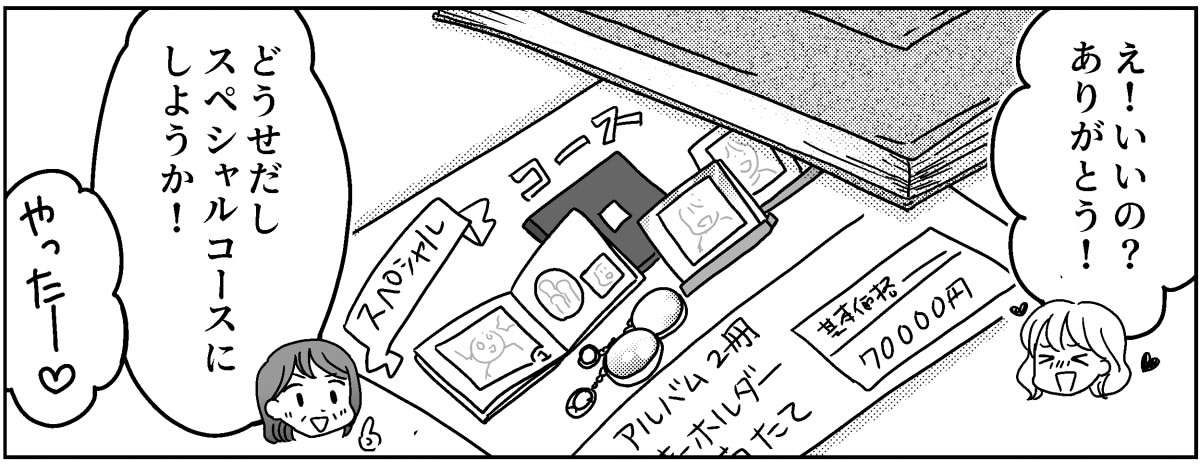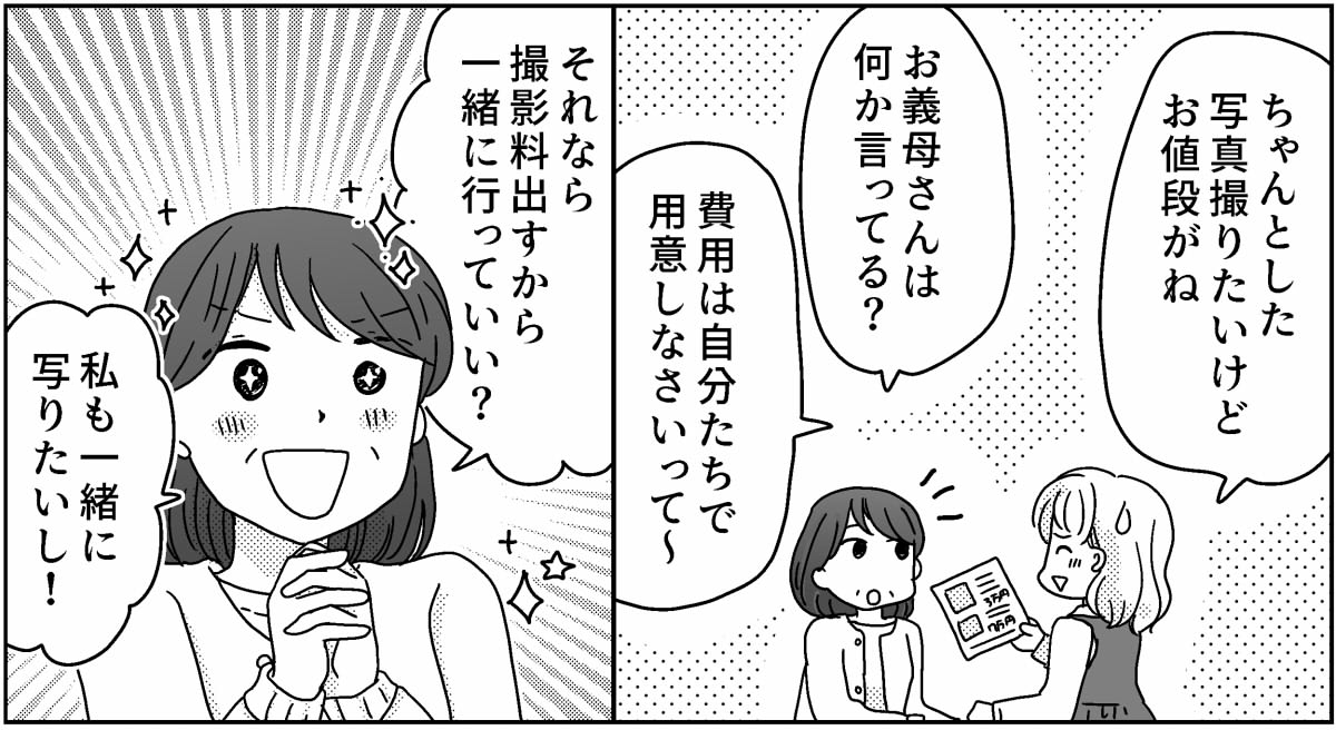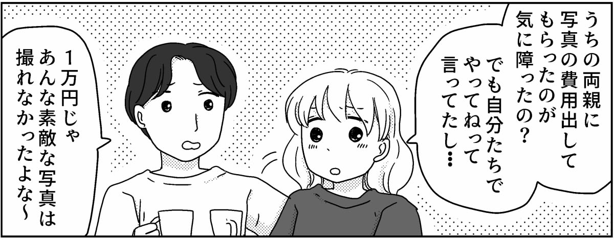 「たくさんあるのね。高かったんじゃない?」なぜか義母の表情がくもります。「両親が出してくれました!」 明らかに義母の機嫌が悪くなりました。やっぱり嫁側に用意してもらうとプライドが傷つくのかしら。でも、義母からお祝いにもらった一万円では、とてもじゃないけれどこんなに豪華なプランでの撮影はできませんでした。