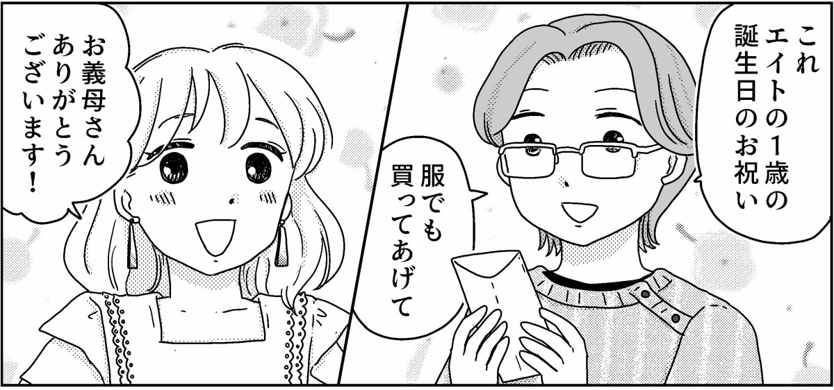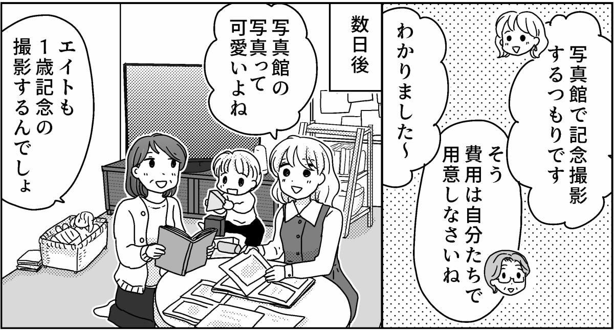 息子の誕生日に義母からお祝いに一万円頂きました。「せっかくなので、写真館で記念写真を撮ろうと思っています」 そんな話を、ちょっと前に義母としました。私自身はきょうだいがいて、母はきょうだいそれぞれの記念日には必ず写真館で写真を撮って飾ってくれていました。 もうすぐはじめての息子の誕生日。ちゃんとした写真を撮っておきたいと思っています。でもなかなか高額なんですよね。安い写真館もあるけれど、思い出に残るものだから……。 ある日、実母と話しているときに「初孫だし私がお金出してあげるから、撮影一緒に行ってもいい? 何枚か一緒に写りたいし!」 そうして実母は写真館で七万円ほどのスペシャルコースの費用を負担してくれたのです。いろいろな服が着られて、キーホルダーや写真立てもたくさん。みんなで家族写真も撮りました。