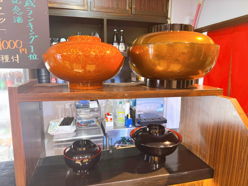 価格とボリュームのアンバランスに驚いていると、店内にビックリサイズの丼ぶりを発見です。