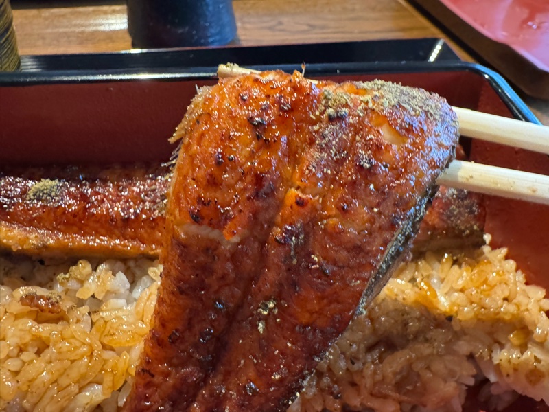 太めのニホンウナギ丸1尾を使用。それも尾先がなく、美しく重箱に敷き詰められています。ご飯にもムラなく特製のタレがかけられています。