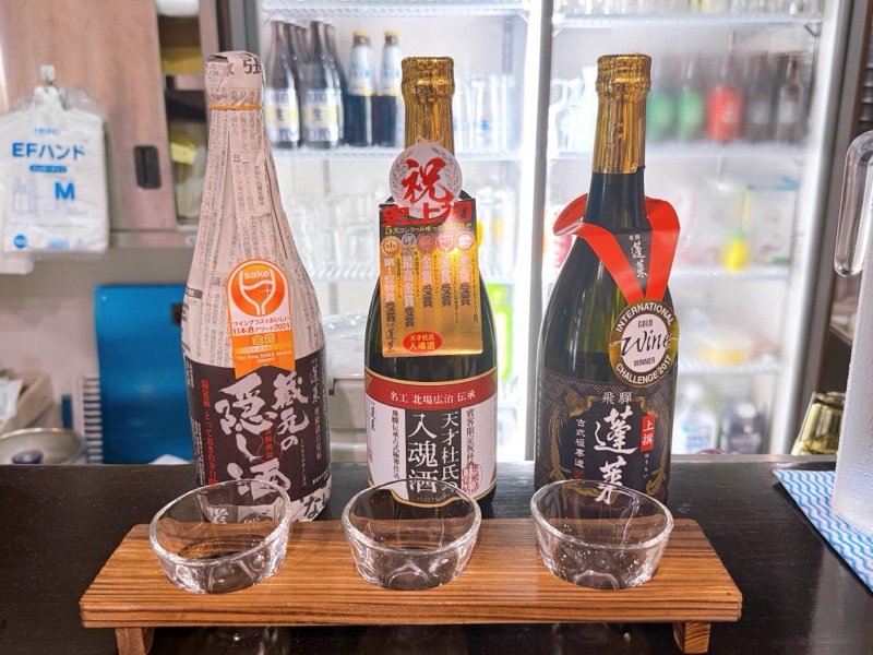 日本酒3種は岐阜県・渡辺酒造の「蓬莱」から、伊勢志摩サミットで海外の貴賓客に提供された「上撰」、2020年モンドセレクション金賞と2021年全国燗コンテスト最高金賞を受賞した「天才杜氏の入魂酒」、そして「蔵元の隠し酒」と飛騨の銘酒を飲むことができます。