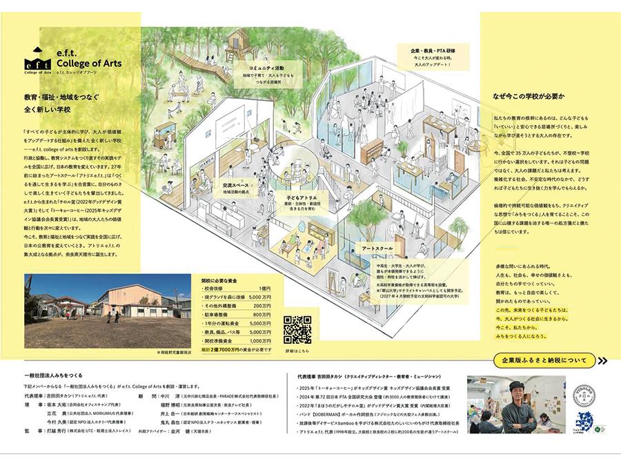 同施設の共同代表のひとり、吉田田(よしだだ)タカシさんはこの度、天理市御経野児童館を活用した新たな教育施設「e.f.t. College of Arts」を創設する。「すべてのこどもが主体的に学び、大人が価値観をアップデートする仕組み」を備えた学校をつくり、新たな日本の教育モデルを提案する。
