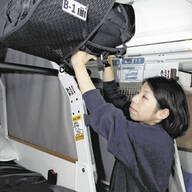 車内のドアガラスには、「箱根フリーパス」「箱根ナビ」「箱根キャリーサービス」「ODAKYU HAKONE FREE Wi-Fi」といった、箱根の旅に便利なサービスを告知するステッカーが掲出されます。