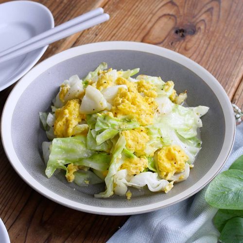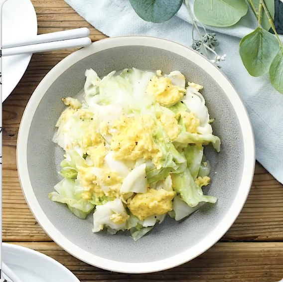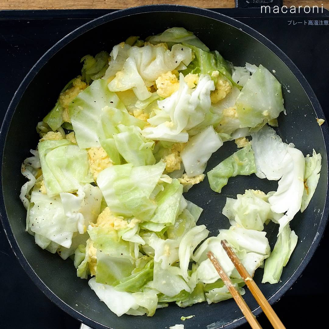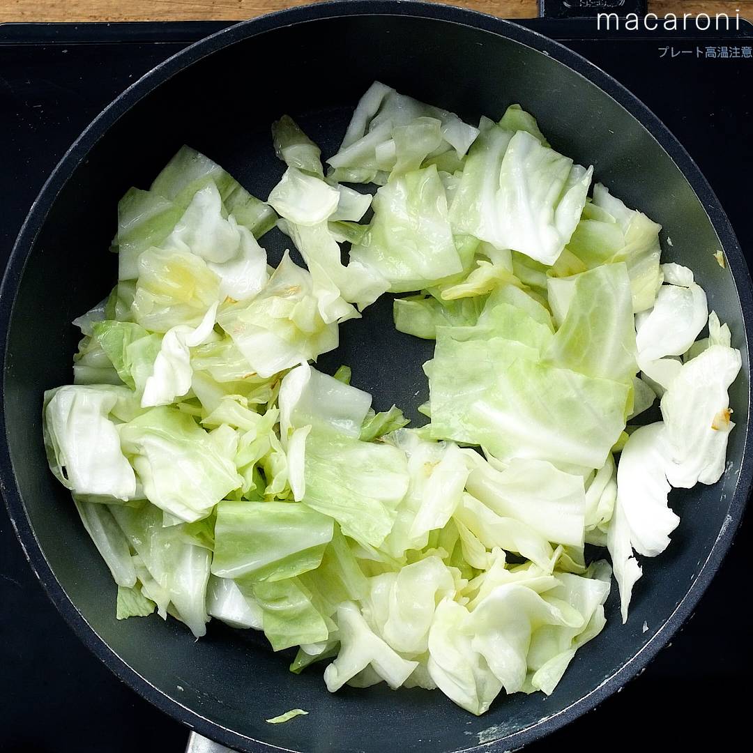 3: サラダ油を加えて熱し、キャベツを加えて表面がしんなりするまで炒めます。(中火3分目安)