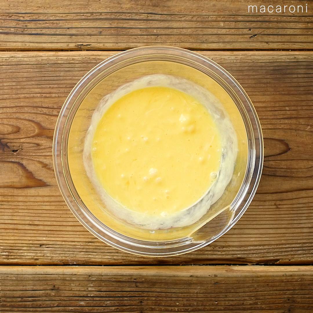 1: 卵をボウルに割り入れ、マヨネーズを半量入れて溶きほぐします。