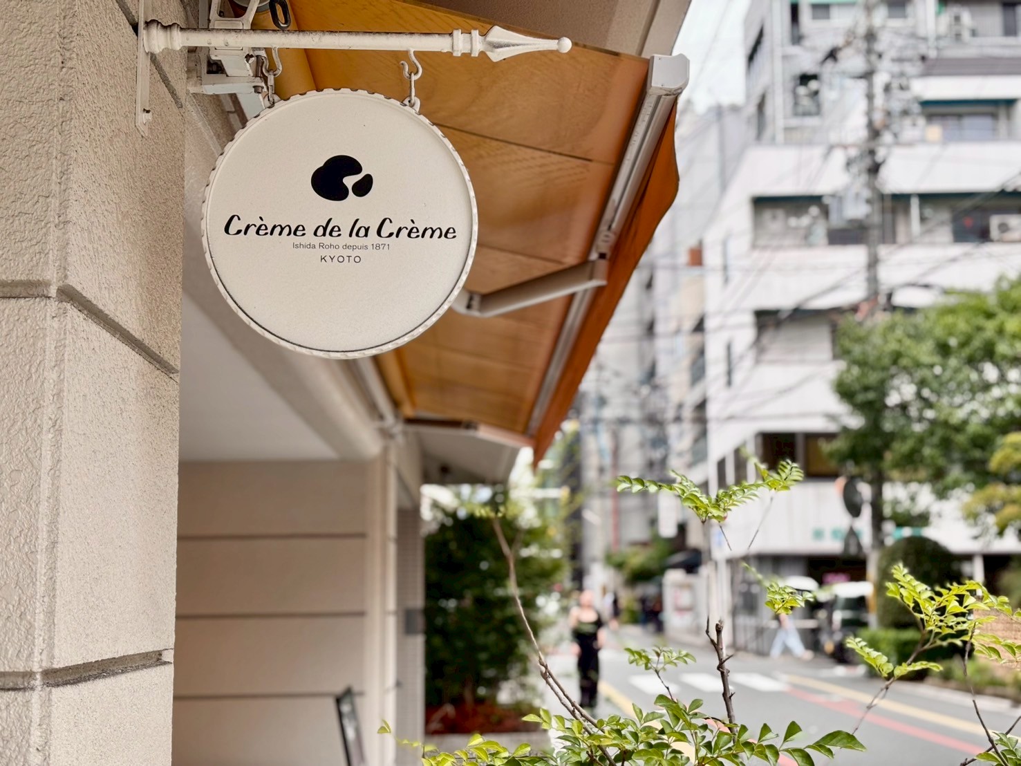 地下鉄烏丸線「烏丸御池駅」3-2出口から徒歩約4分。白い建物に黄色いシェードが目印の「クレーム デ ラ クレーム」は、シュークリーム専門店です。サクサクのシュー生地に濃厚なカスタードクリームを詰め込んだ定番商品に加え、季節限定フレーバーなど様々なシュークリームを展開しています。今回いただいたのは、店舗スタッフさんおすすめの一品。
