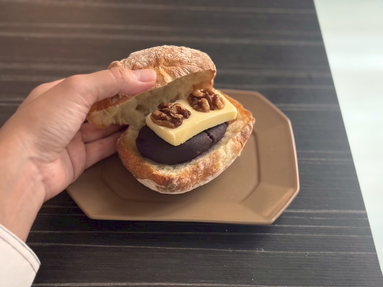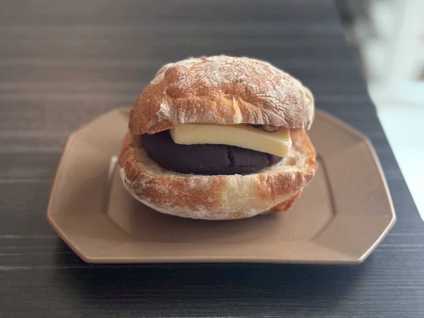 店内で焼き上げた「チャバタ」に特製のこしあん、たっぷりのバター、くるみ、ラムレーズンをサンドしたボリュームも満点な一品。甘さ控えめのこしあんにバターの塩味、チャバタの香ばしさが重なりあう奥深い味わいは、唯一無二のおいしさです。