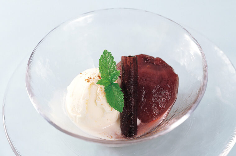 ❺うつわに盛り付けバニラアイスを添える。その上にシナモンパウダーを振りかけて、ミントを飾る。