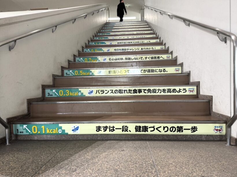 新潟県庁の階段には、健康標語や消費カロリーが記載されている「啓発ステッカー」が貼られている
