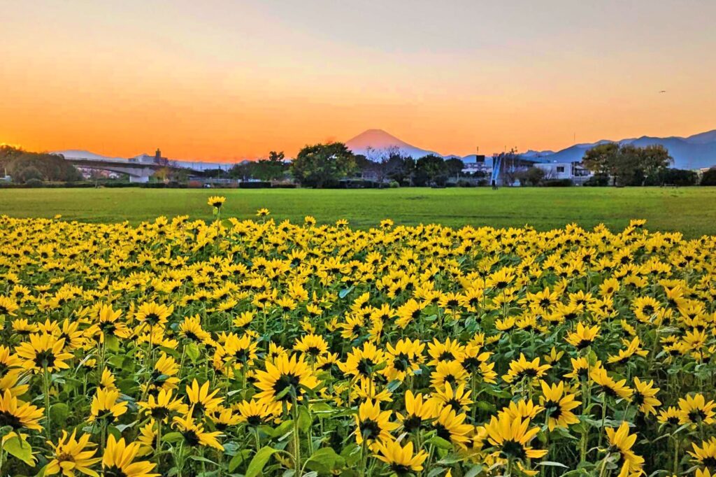 特筆したいのは、「川とのふれあい公園」内の花壇に咲く約3万本のひまわりと冠雪した富士山の雄姿の鮮やかな景色。富士山が最も美しく見えるのは、11月から2月と言われているが、初冬の空気が澄んだ晴れた日には、絵葉書のような絶景が目の前に広がる。