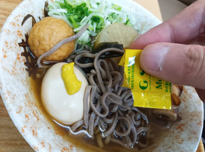 練り物と玉子だけじゃない! 大根もこんにゃくも結び昆布もおでんの具が一通り入っていて、真のおでんそばを感じた。おまけに辛子までついてきて、もはやメインがおでんである。立川のおでんそばは四天王最弱だったのかもしれない。