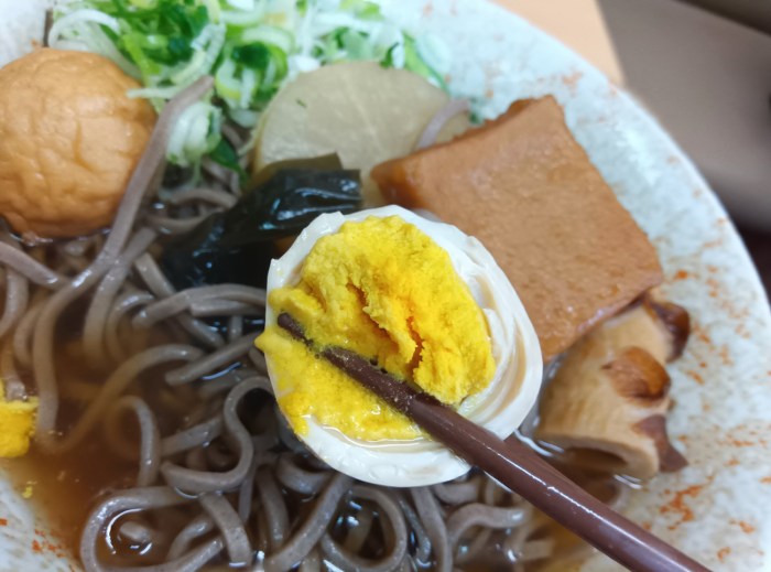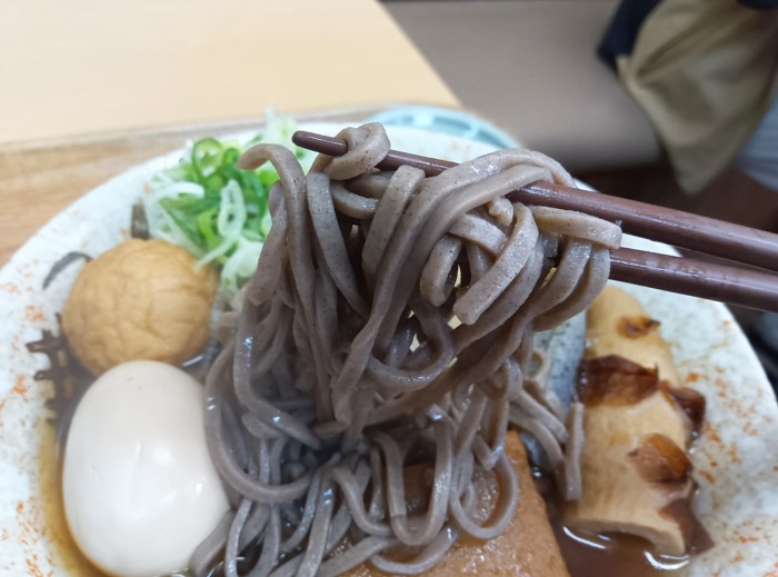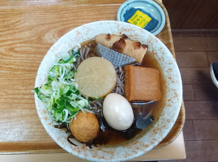 では味はどうなのかと言うと、そばつゆもおでんも醤油系のつゆだから特に違和感はない。違和感はないけど、練り物や大根、こんにゃくは、そばのタネとしては珍しい部類に入るので、微妙によそ者オーラは出ている。