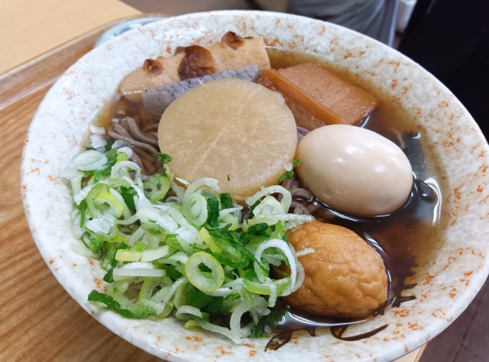 駅そばメニューで立川以上のガチ感を漂わせるおでんそばに出会った。立川駅そばはがんもどき、玉子、さつま揚げのどれか1種か、がんもどき+玉子の組み合わせだけど、こちらの「おでんそば(税込860円)」は……