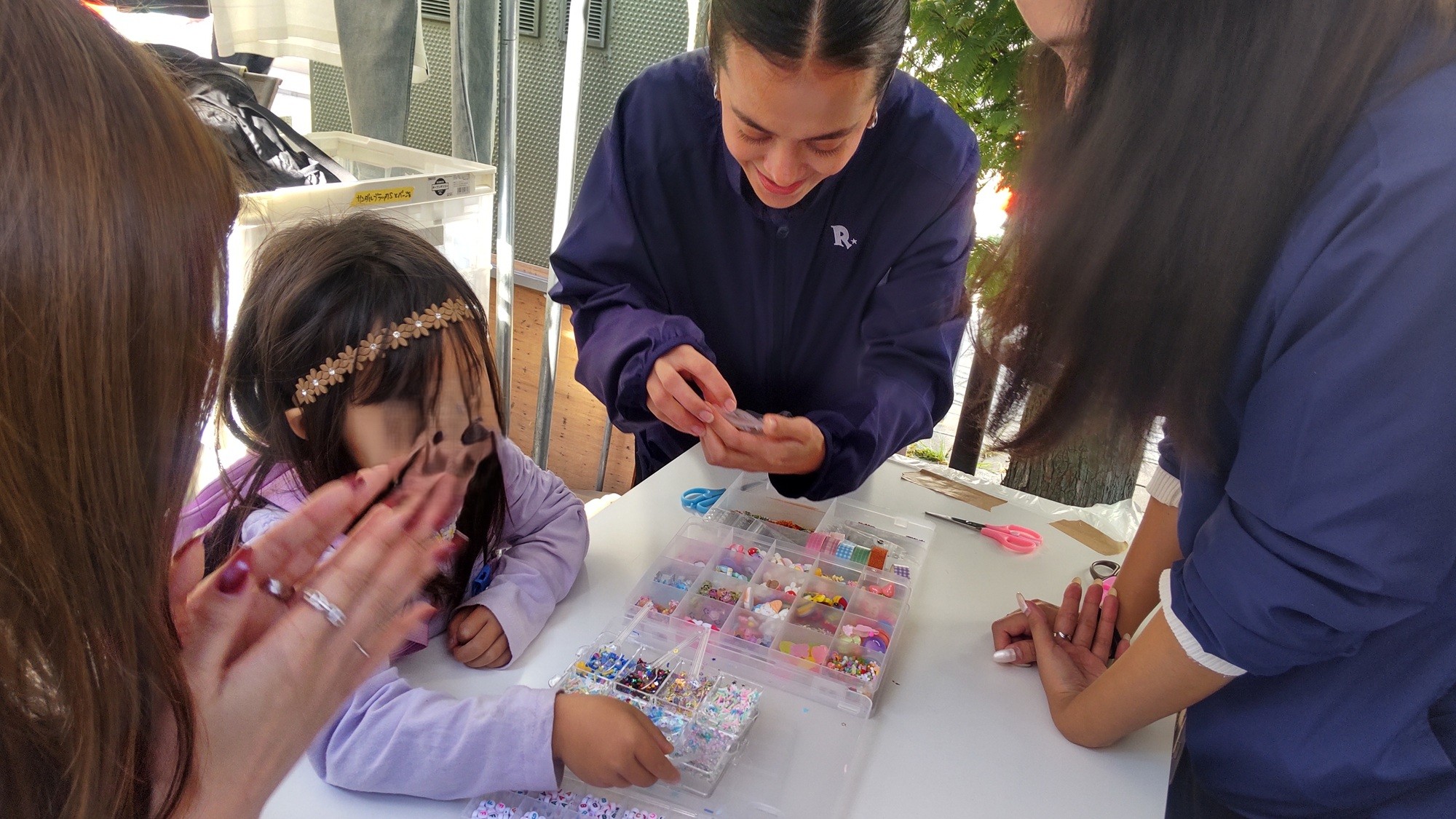 自分好みのキーホルダーがゲットできるとともに、国籍の異なる優しいお姉さんたちからちょっとした英語に触れられ、世界への扉が開かれるきっかけとなるような体験でした。