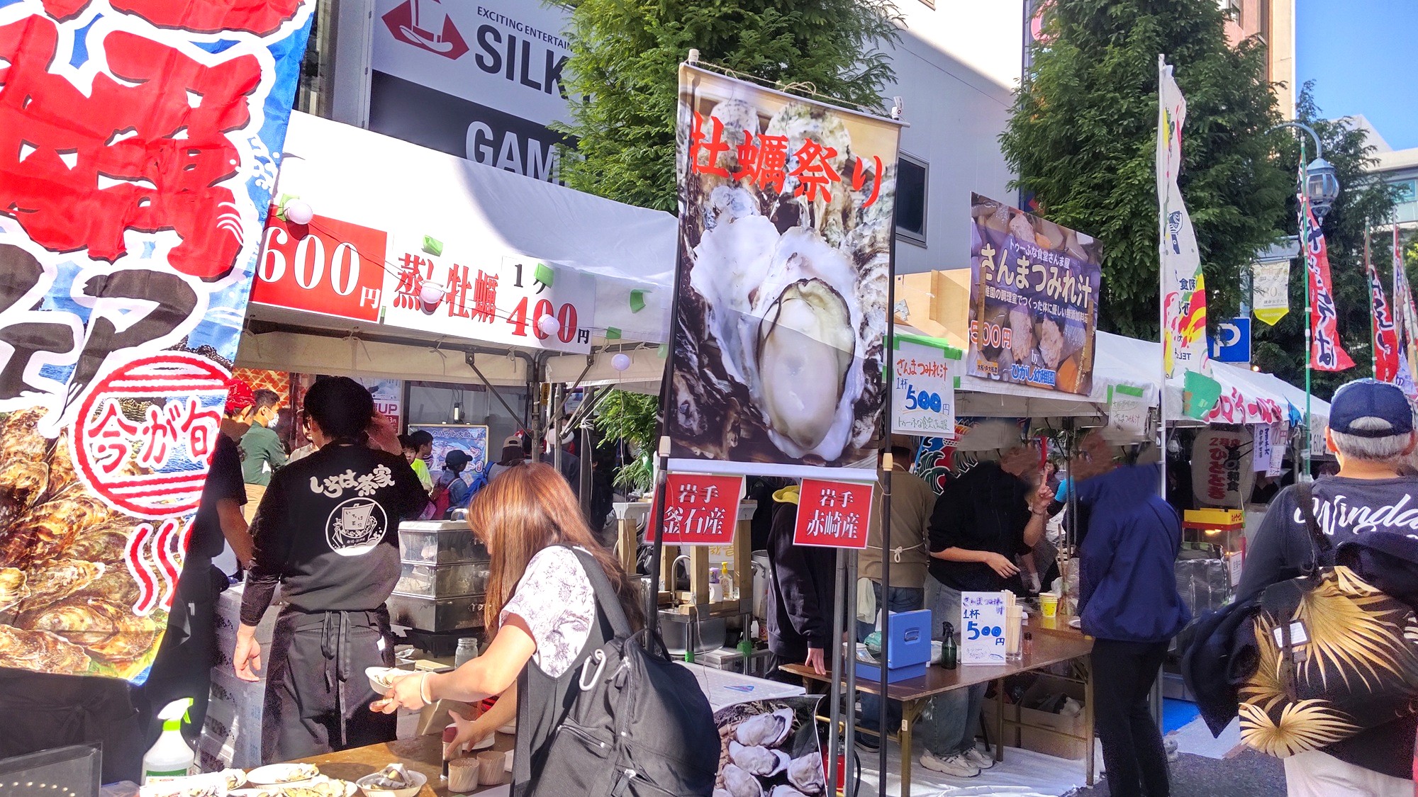 蒸し牡蠣やイカ焼きそばなどの海鮮グルメ、定番の名産品や人気酒蔵からは日本酒が販売されていました。訪れたことのない都市の魅力を地元に居ながら感じられ、旅心をくすぐられます。