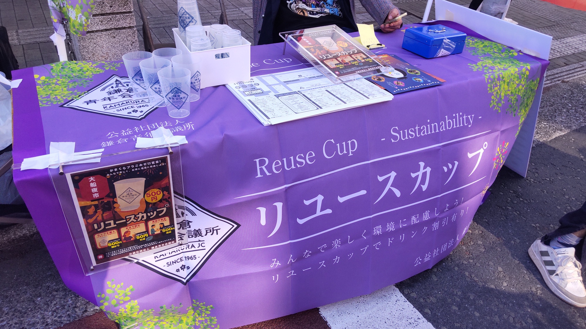 大船夜市では、サステナブルな取り組みにも力を入れているようです。リユースカップ 500円(税込)を購入して、指定の店舗でサービスやドリンクの割引を受けることができるというもの。