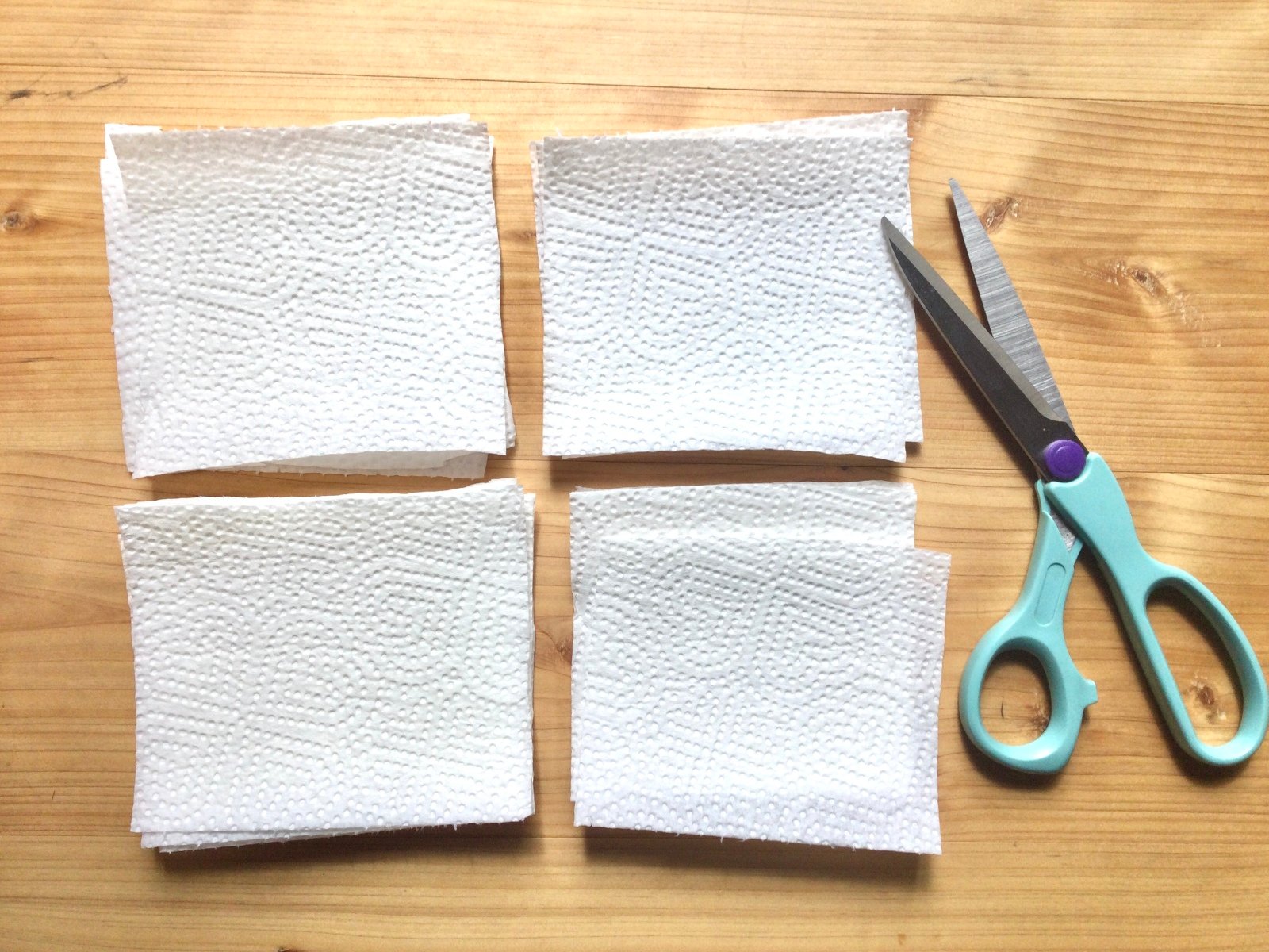 まず、約5枚ほどのキッチンペーパーを重ね、ハサミで半分に切ります。続いてもう一度半分に切り、4分の1サイズになるように調整します。