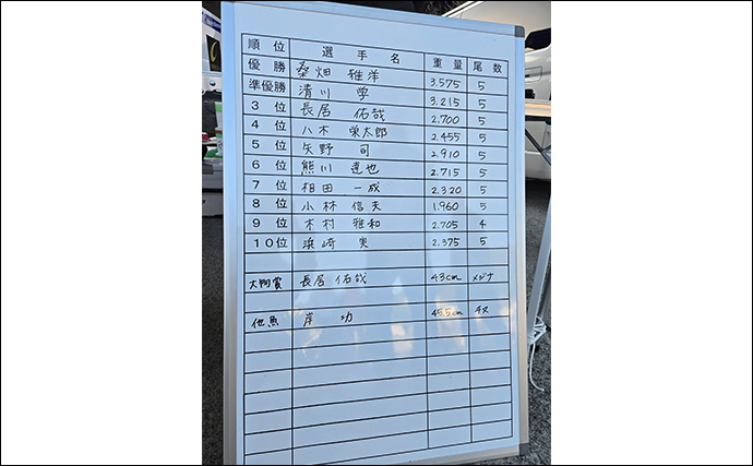 表彰式は総合10位まで、レディース賞、大物賞、東レ賞、お楽しみ抽選会など豪華賞品で大いに盛り上がった。無事に開催でき、早朝より一日協力して頂いたすさき丸船長様、弁天丸船長様、この場をお借りして御礼申し上げます。