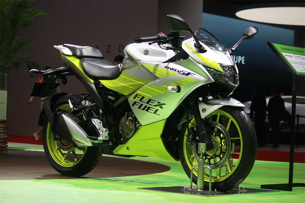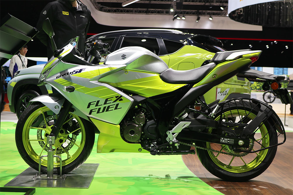 FFV(Flexible Fuel Vehicle)とは「フレックス燃料車」のこと。スズキ「ジクサーSF250」をベースとしたこの「GIXXER SF 250 FFV」は、すでにインド市場で販売されているモデルで、ガソリンとバイオエタノール混合燃料(混合率は約20%〜85%)の双方に対応しているのが特徴です。日本のバイオエタノールの自給率は0%ですが、東南アジアではサトウキビから、アメリカ大陸ではトウモロコシから植物油を抽出して燃料化しています。