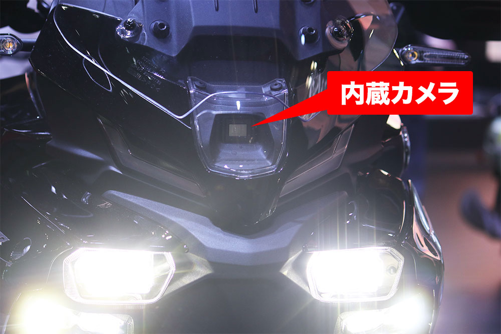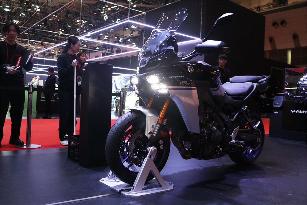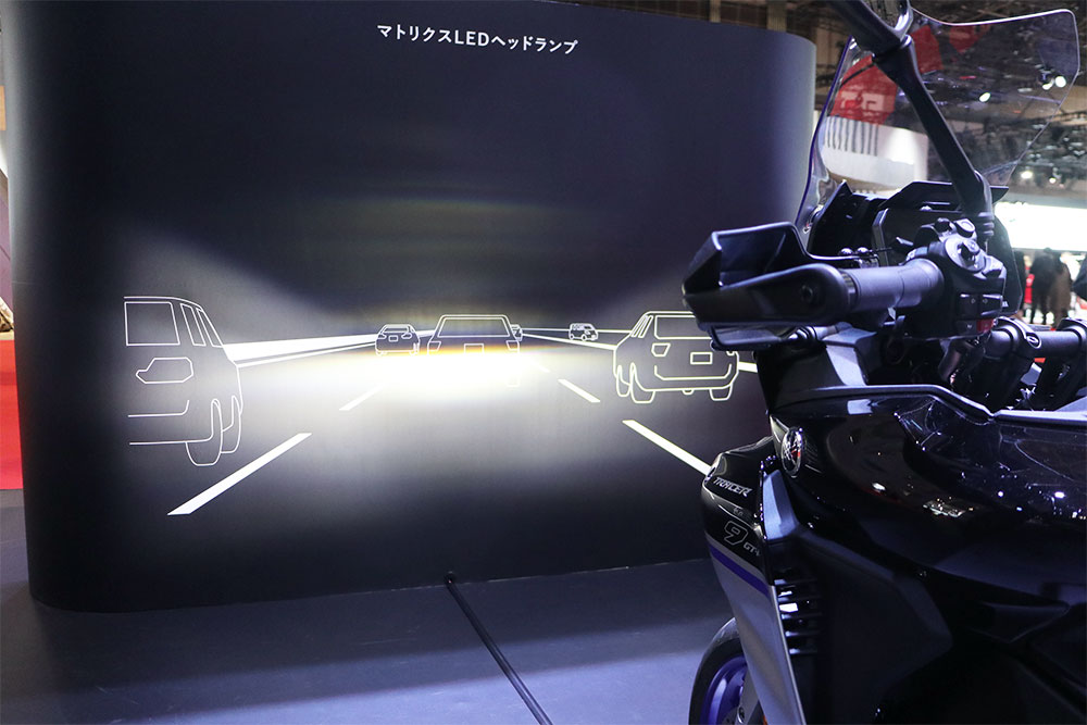 2025年に発売されたロードツアラーモデル「TRACER9 GT」と「TRACER9 GT+ Y-AMT」。この2機種には、世界初となる「二輪車用マトリクスLEDヘッドランプ」が搭載されています。複数のロー / ハイビーム用LEDと上部のカメラによって構成されたシステムで、交通状況を判断し、照射エリアを自動的に調整します。モビショーでは、それを体感できる展示スペースが設けられていました。