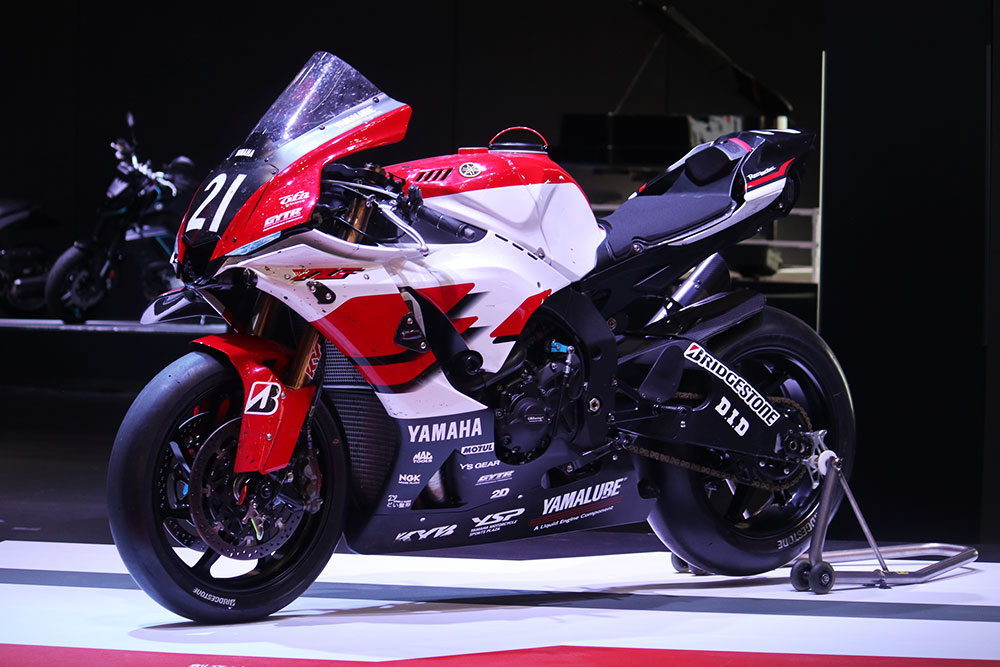 創立70周年を迎えるにあたり、6年ぶりにファクトリーチームを復活させて今年の鈴鹿8耐に挑んだヤマハ。中須賀 克行選手、ジャック・ミラー選手、アンドレア・ロカテッリ選手らの活躍により、トップと同一周回の2位でチェッカーを受けました。ブースに展示されていた「YZF-R1 鈴鹿8耐仕様」は、このときに使用された実車です。1999年発売のスーパースポーツモデル「YZF-R7」のカラーリングをベースに、1990年代後半の雰囲気と新しいデザインワークを巧みに融合させた車体色が印象的でした。展示コーナーでは、レースファンと思しき来場者が細部を食い入るように見ていました。