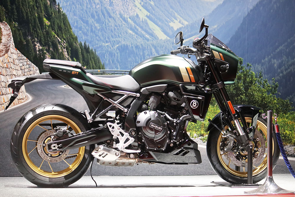 GSX-8Tのバリエーションモデルがこの「GSX-8TT」です。ヘッドライトカウルとアンダーカウルを追加したほか、1970年代のロードレーサーをモチーフとしたカラーリングで差別化を図っています。モデル名の「TT」は、ベースモデルのGSX-8Tの末尾と、「Timeless」の頭文字を掛け合わせたネーミングです。