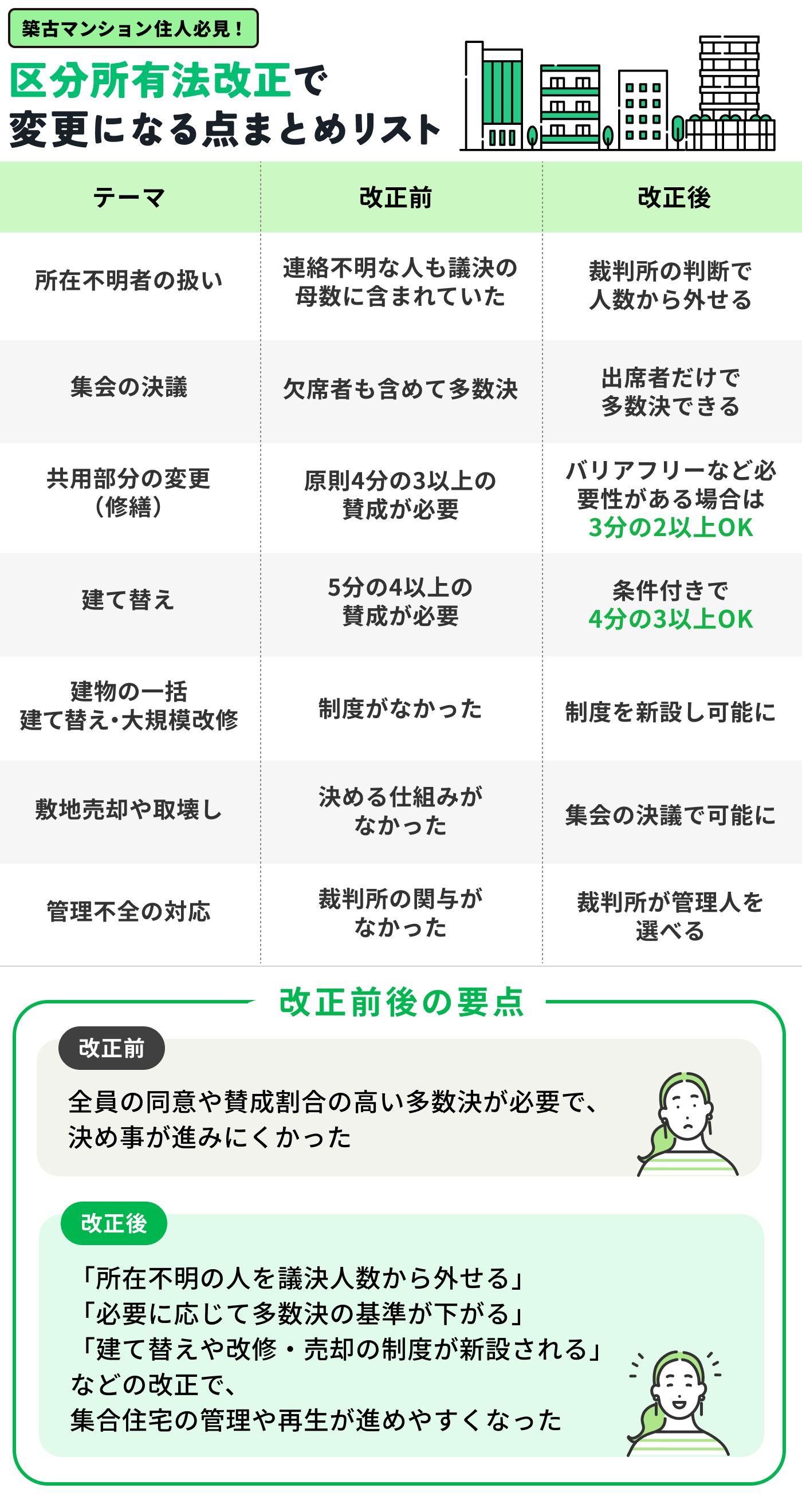 本記事では、区分所有法の改正で何がどう変わるかにポイントを絞って整理し、マンションに住んでいる人の生活や資産への影響を確認していきます。
