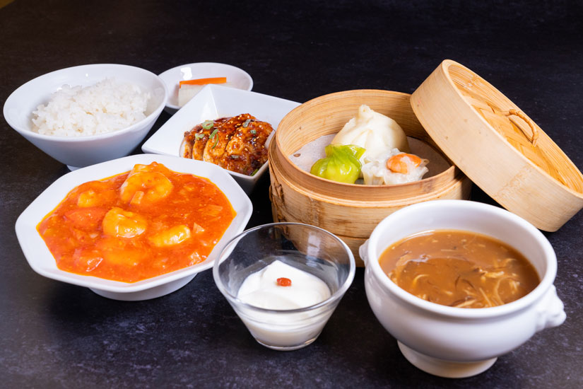 「よだれ鶏」「エビのチリソース」「点心3種」・「フカヒレスープ」・ご飯・デザートがセットになった人気の豪華メニュー