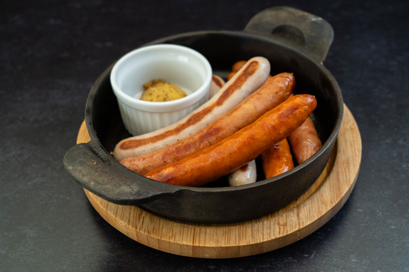 信州産のソーセージ3種類の盛り合わせを鉄板で提供。ワンちゃんと一緒に来店も可能。