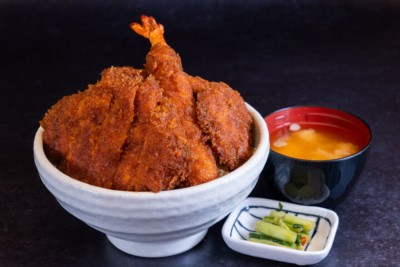 信州駒ヶ根名物「ソースかつ丼」を楽しめるリピーターも多い有名店。ロース・ヒレ・エビの3種類を盛り合わせた贅沢な丼