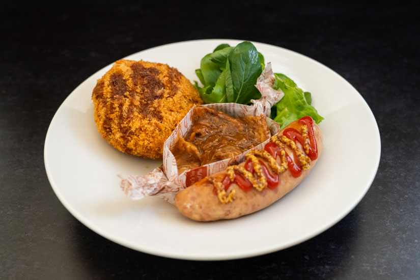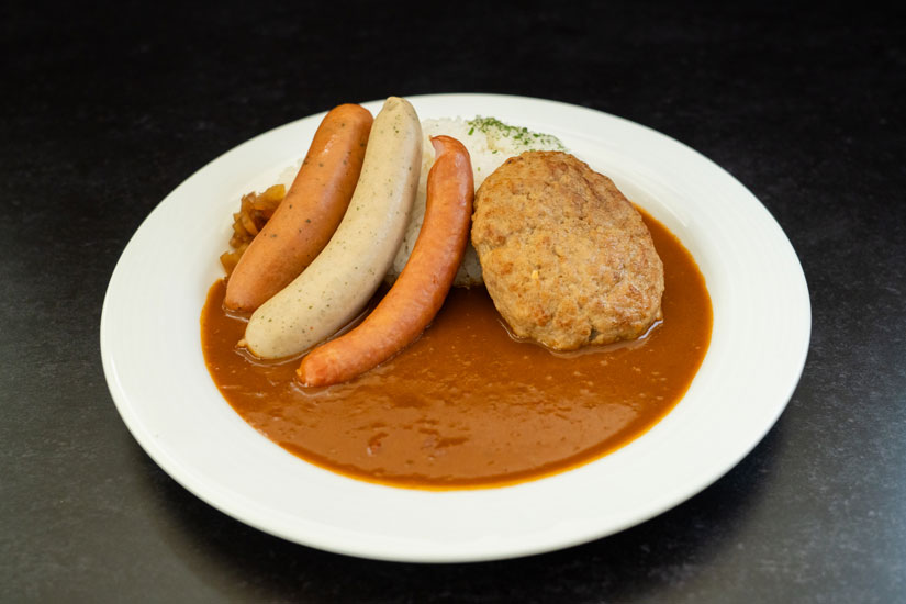 信州産の上質な素材を使用したハンバーグとソーセージ3本が乗ったまんぷくカレー。よく見ると「30」!